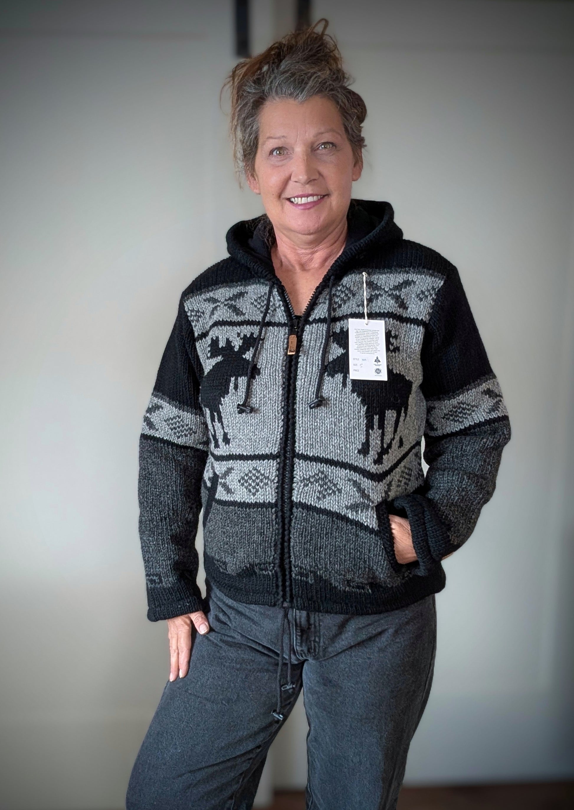 Stay cozy and stylish in our unisex Wool Zip Front Hooded Jacket. Designed with warmth in mind, this jacket features a fleece lining and a fun moose design. Handcrafted in Nepal, it's the perfect addition to your unique wardrobe. (I'm wearing a small in the photos - fit may vary based on personal style.)